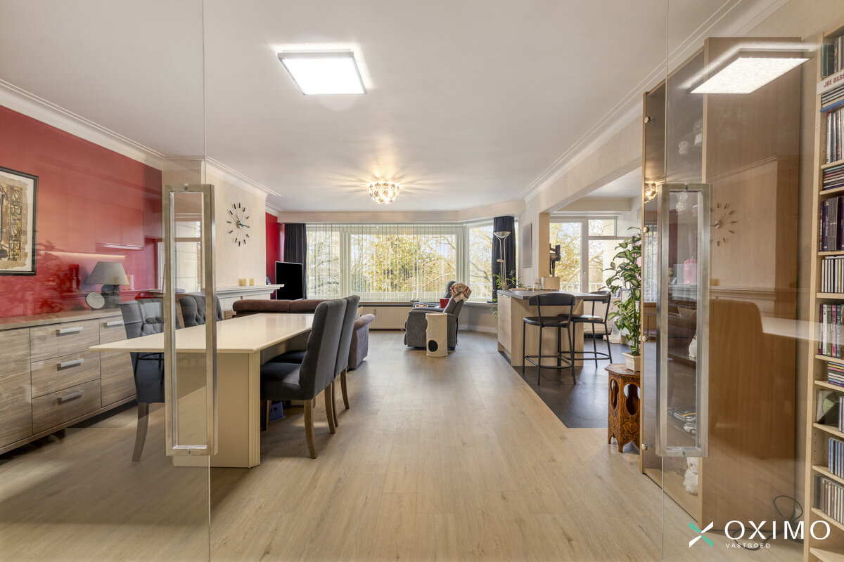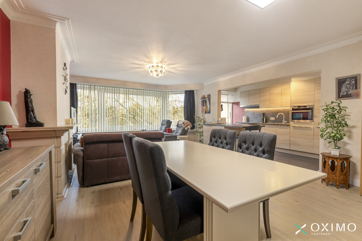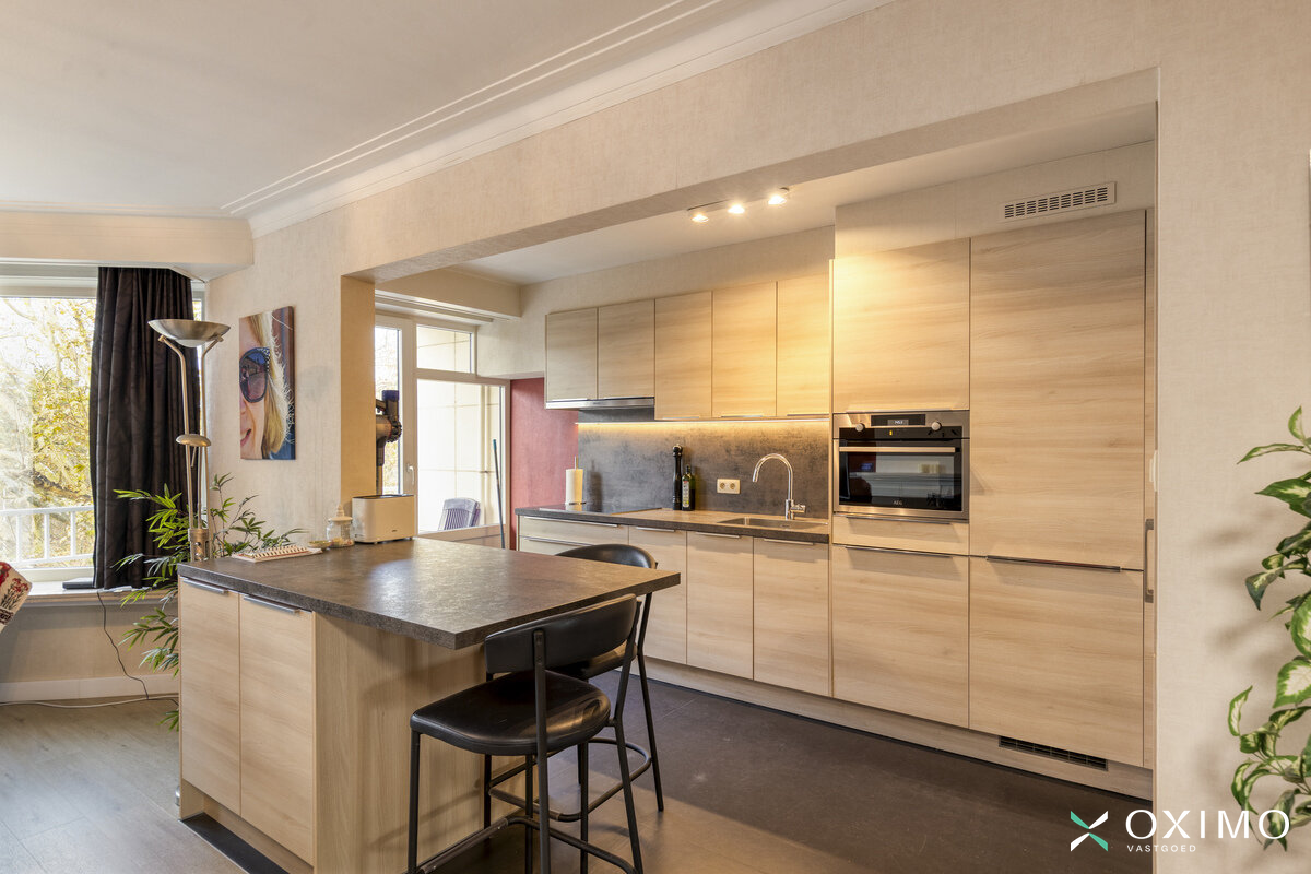 De ruime leefruimte vormt het centrum van het appartement en baadt in natuurlijk licht. De open keuken sluit mooi aan op de living en is ideaal voor wie houdt van gezellig koken. Aansluitend bevindt zich een praktische berging, wat extra opbergruimte biedt.