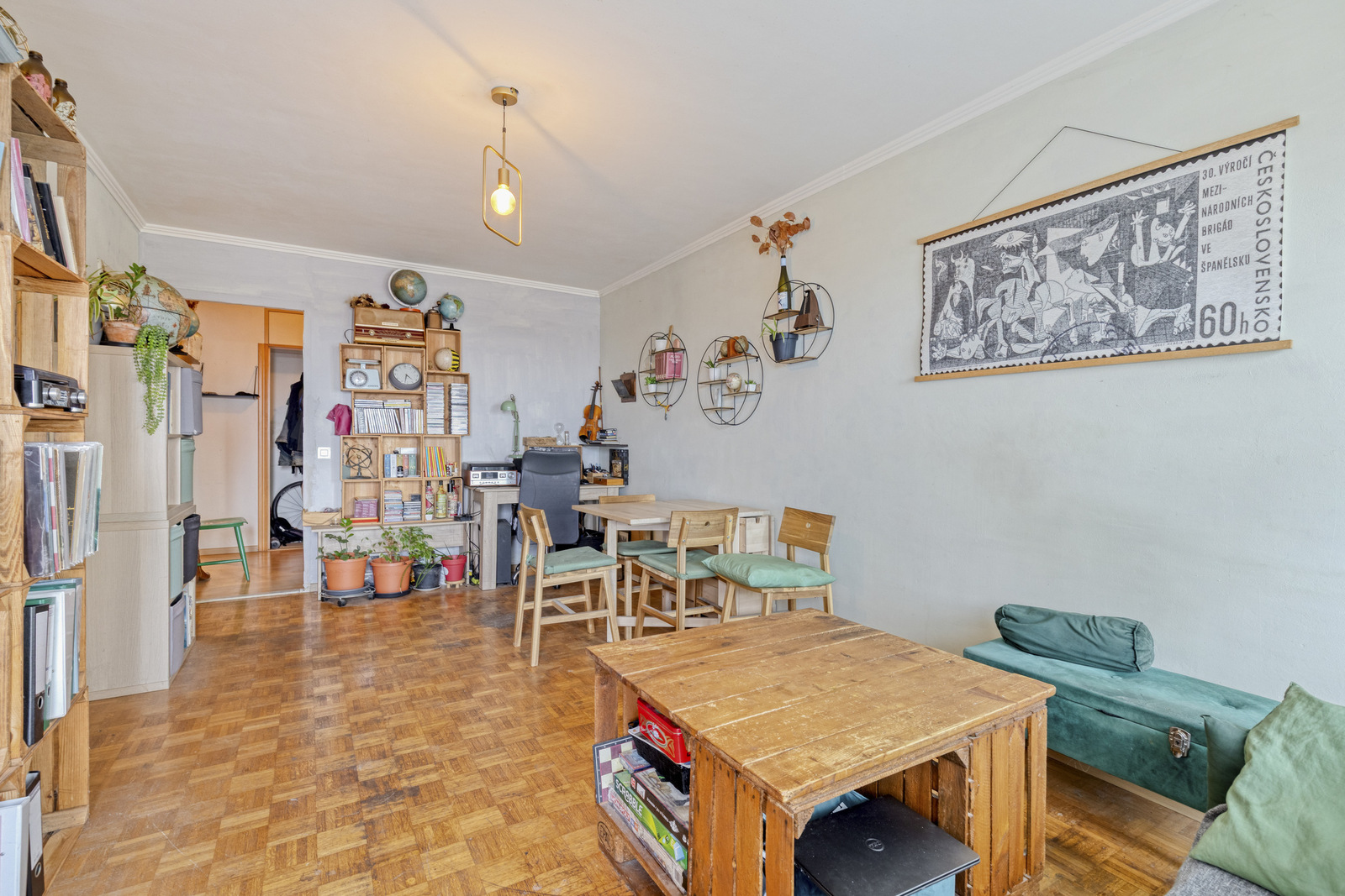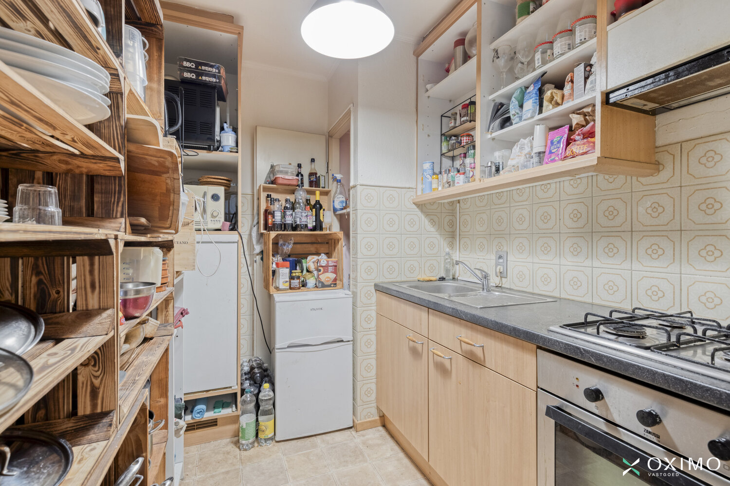 De ruime leefruimte met originele blokparketvloer zorgt voor een warme, authentieke sfeer. De keuken en badkamer kunnen naar eigen smaak opgefrist worden – ideaal om er jouw persoonlijke touch aan te geven.