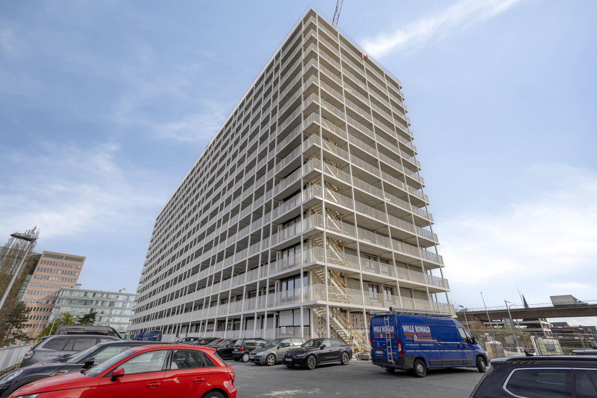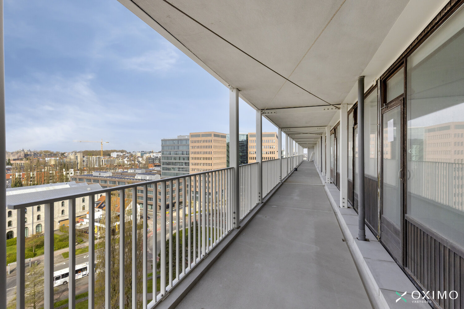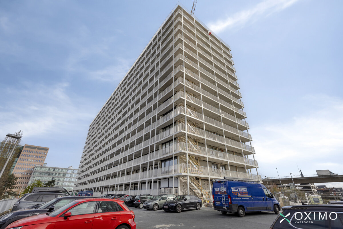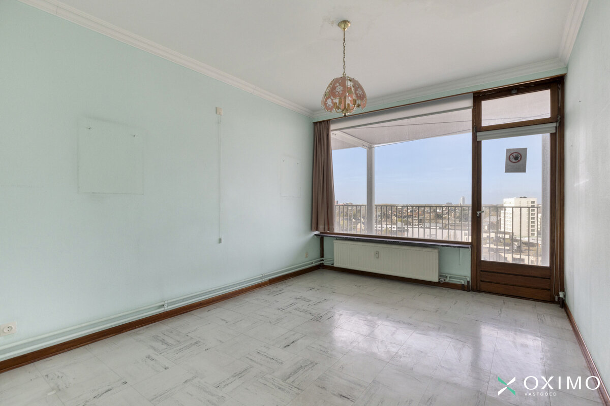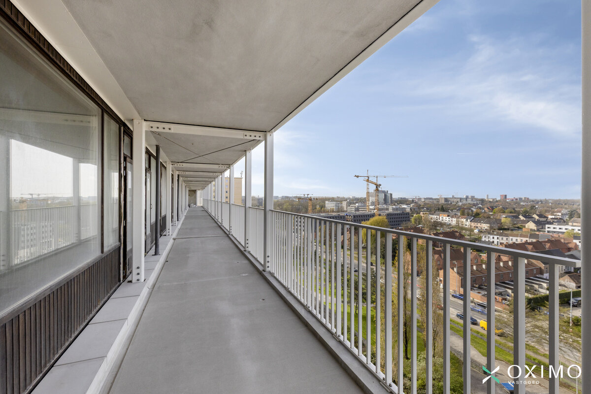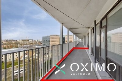 9de verdieping: inkomhal met vestiairekast, lichtrijke leefruimte (28 m²), keuken (9 m²), nachthal, badkamer (4 m²), slaapkamer (14 m²) en een ruim terras van 20 m² dat recent werd vernieuwd. De rode lijn op de foto toont tot waar het terras loopt; de tussenschutting wordt nog geplaatst.