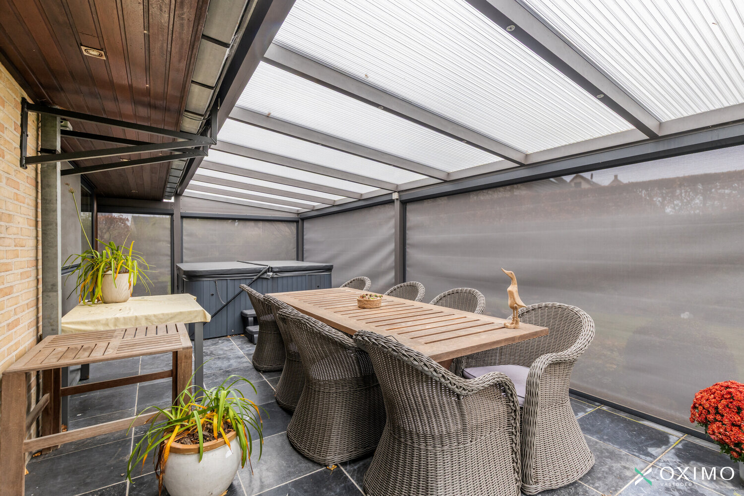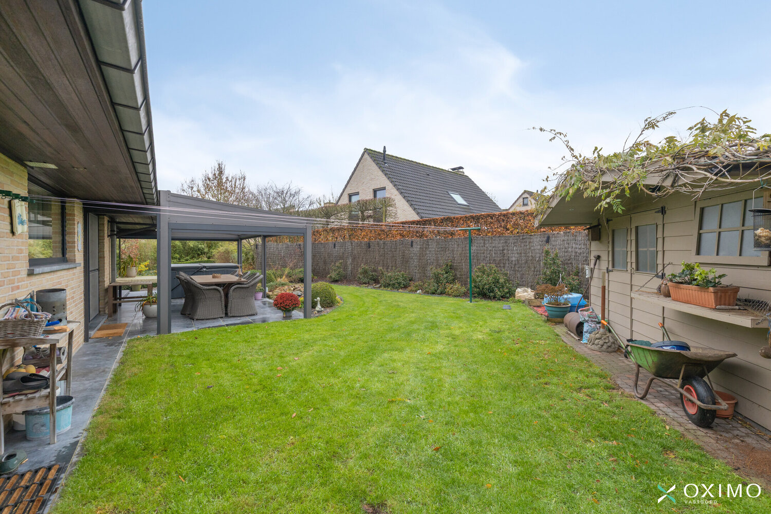Via de leefruimte heb je toegang tot het overdekte terras, voorzien van een degelijke overkapping waaronder een jacuzzi staat – een heerlijke plaats om het hele jaar door tot rust te komen. De tuin biedt veel privacy en een aangenaam uitzicht op het omliggende groen.